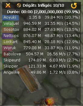 Il indique les dégâts infligés, la vitesse d’exécution (DPS), ainsi que la contribution relative de chaque joueur durant un combat.