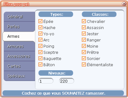 Pour le cas particulier des armes et armures (pièces d'équipements), il est également possible de filtrer les objets ramassés selon la classe auxquels ils appartiennent. Enfin les armes, armures et accessoires peuvent être filtrés par niveau (bornes min. et max. à définir par le joueur).