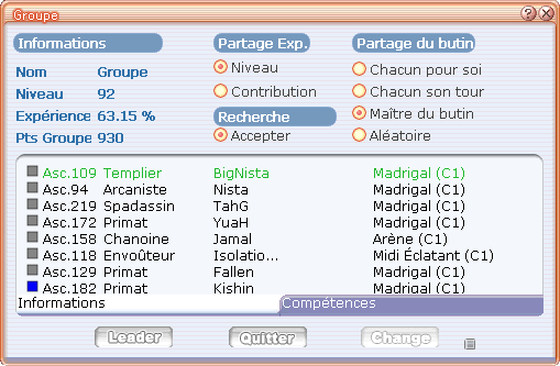 * ![](https://177885671-files.gitbook.io/~/files/v0/b/gitbook-x-prod.appspot.com/o/spaces%2F6mTLjdSCE2vyqj2aHMNB%2Fuploads%2FqZ80FD2A22OzSjyGg55c%2Fparty4.png?alt=media\&token=19daad0d-593b-4ef2-ab5b-752c5ced0b6d)**Leader** : Attribue aux membres du groupe les buffs Primat si le Leader est un Primat et les buffs Chanoine si le Leader est un Chanoine.