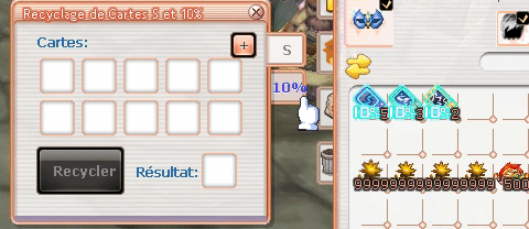 Le recyclage de cartes permet de recycler 10 cartes S (respectivement 10%) en échange d'une carte S (respectivement 10%) aléatoire. Il suffit d'avoir les 10 cartes en inventaire puis de sélectionner "Recycler". Attention, il est précisé que le système choisit 10 cartes aléatoires en inventaire, il est donc conseillé de déplacer les cartes ne faisant pas l'objet du recyclage ailleurs qu'en inventaire lors de la manipulation. L'ensemble de ces cartes peut être trouvé dans l’instance Le Jardin Secret de Rhisis.