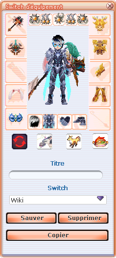 Le switch d’équipement est un système permettant d’équiper en un clic une combinaison d’équipements (arme, bouclier, bijoux, set, cape, masque, fashion, familier, ramasseur). Des festins peuvent également être insérés dans un switch, de manière à régénérer tous les points de vie du personnage lors du switch.