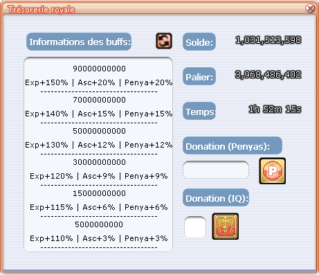 La Trésorerie Royale est un système permettant aux joueurs de faire des dons de penyas ou d'items de quêtes (IQ) pour alimenter un solde, qui s'il est suffisant, déclenche un buff de trésorerie toutes les **2 heures (paires)** qui profite à l'ensemble des joueurs.