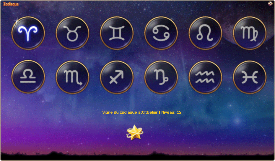 Il propose les 12 signes astrologiques, chacun offrant des bonus uniques à vos personnages.\